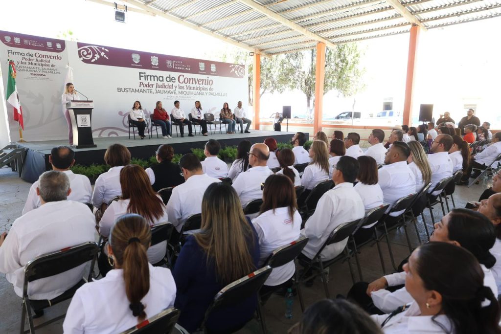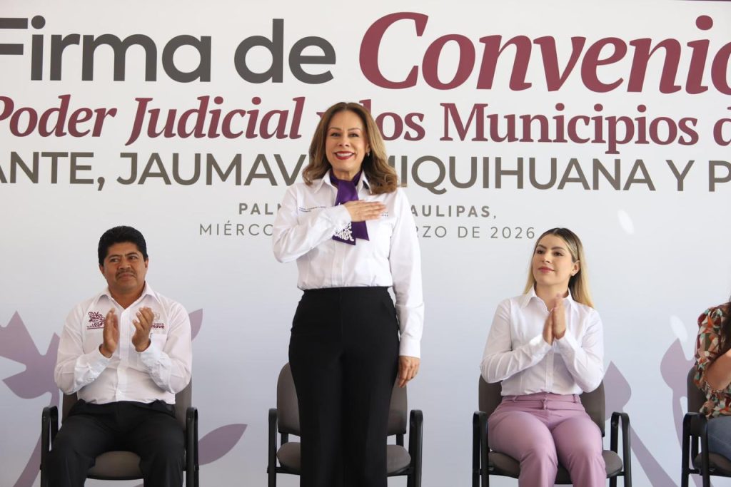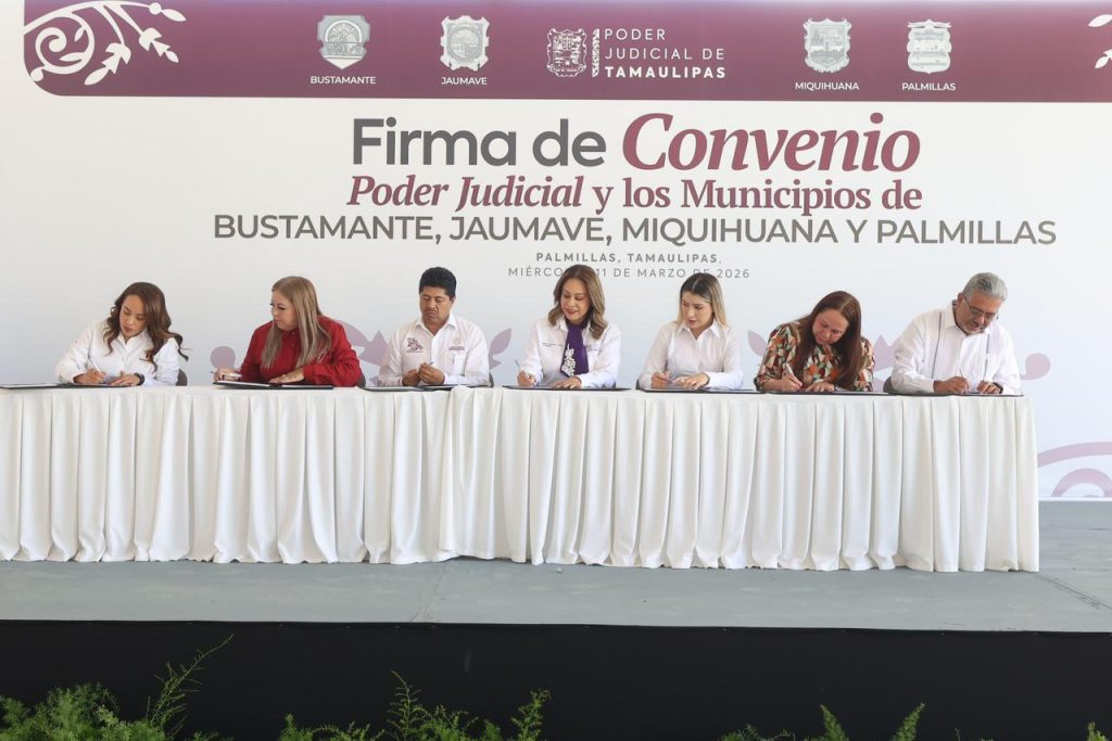 El acuerdo fue suscrito por la Magistrada Presidenta del Poder Judicial del Estado, Tania Contreras López, junto con el presidente municipal de Jaumave, Manuel Báez Martínez; la presidenta municipal de Bustamante, Maricela Rodríguez González; la presidenta municipal de Miquihuana, Gladis Magalis Vargas Rangel; y la presidenta municipal de Palmillas, Sindy Paoleth Monita Ramírez.