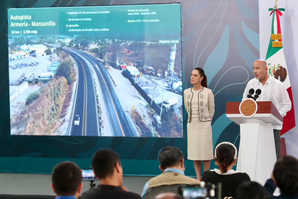 En cuanto a la modernización de la autopista Armería-Manzanillo, Esteva Medina informó que se ampliará de cuatro a seis carriles. Ya se concluyeron 18 kilómetros y se prevé que la obra quede terminada en diciembre de 2026.
