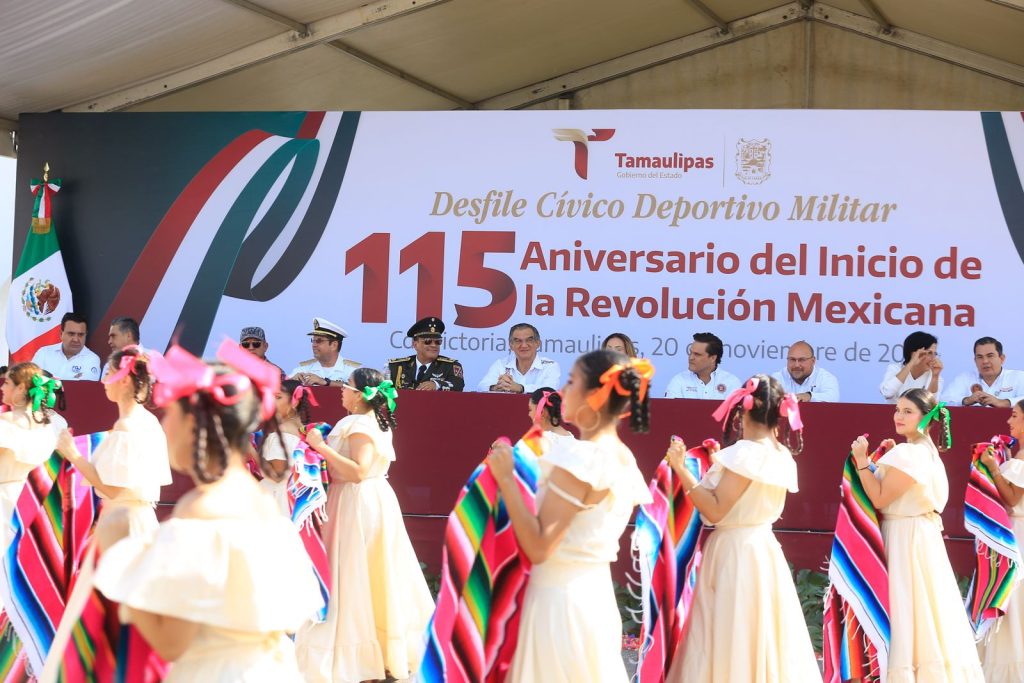 Ciudad Victoria, Tamaulipas.- Con la presentación, por primera vez, de una banda de guerra monumental integrada por 500 alumnos y alumnas de diferentes municipios, este jueves se conmemoró el desfile cívico, deportivo y militar, con la entusiasta participación de estudiantes, jóvenes, niñas y niños, en conmemoración del 115 aniversario del inicio de la Revolución Mexicana, presidido por el gobernador Américo Villarreal Anaya.