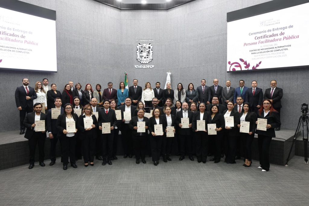 Este logro fue celebrado durante la Ceremonia de Entrega de Certificados de Persona Facilitadora Pública, realizada en el Auditorio del Poder Judicial de Tamaulipas, donde se reconoció al personal del Centro de Mecanismos Alternativos para la Solución de Conflictos que acreditó el proceso de evaluación y certificación 2025. La Magistrada Presidenta del Poder Judicial de Tamaulipas, Tania Contreras López, destacó durante el evento el compromiso institucional con una justicia más humana, ágil y cercana a la ciudadanía.