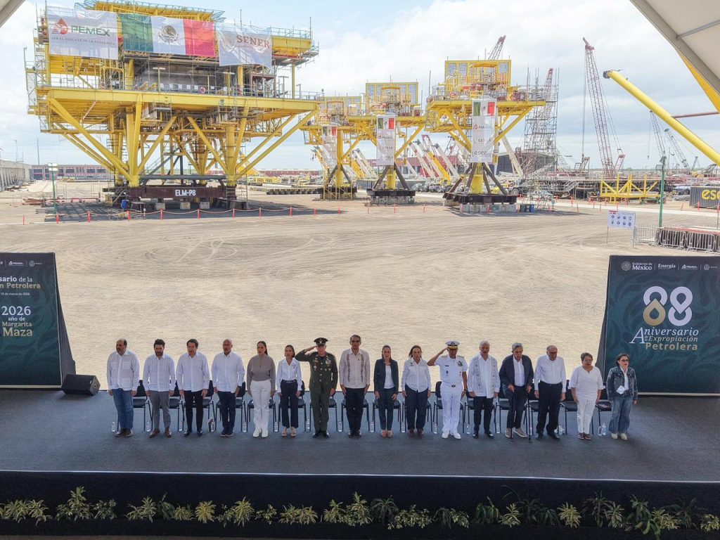 Durante el evento celebrado en el Patio Industrial de Pueblo Viejo, Veracruz, y junto a la gobernadora anfitriona Rocío Nahle García, al pie de las nuevas plataformas petroleras marinas construidas por Petróleos Mexicanos, la presidenta Claudia Sheinbaum destacó la presencia de Américo Villarreal, a quien consideró “un hombre nacionalista y visionario”.