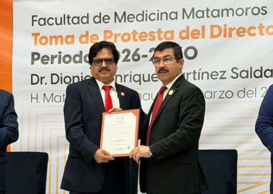 “ Reiterando el compromiso de fortalecer la calidad educativa y consolidar el liderazgo institucional, el rector de la Universidad Autónoma de Tamaulipas (UAT), Dámaso Anaya Alvarado, encabezó la toma de protesta del Dr. Dionisio Enrique Martínez Saldaña como director de la Facultad de Medicina Matamoros para el periodo 2026-2030. “