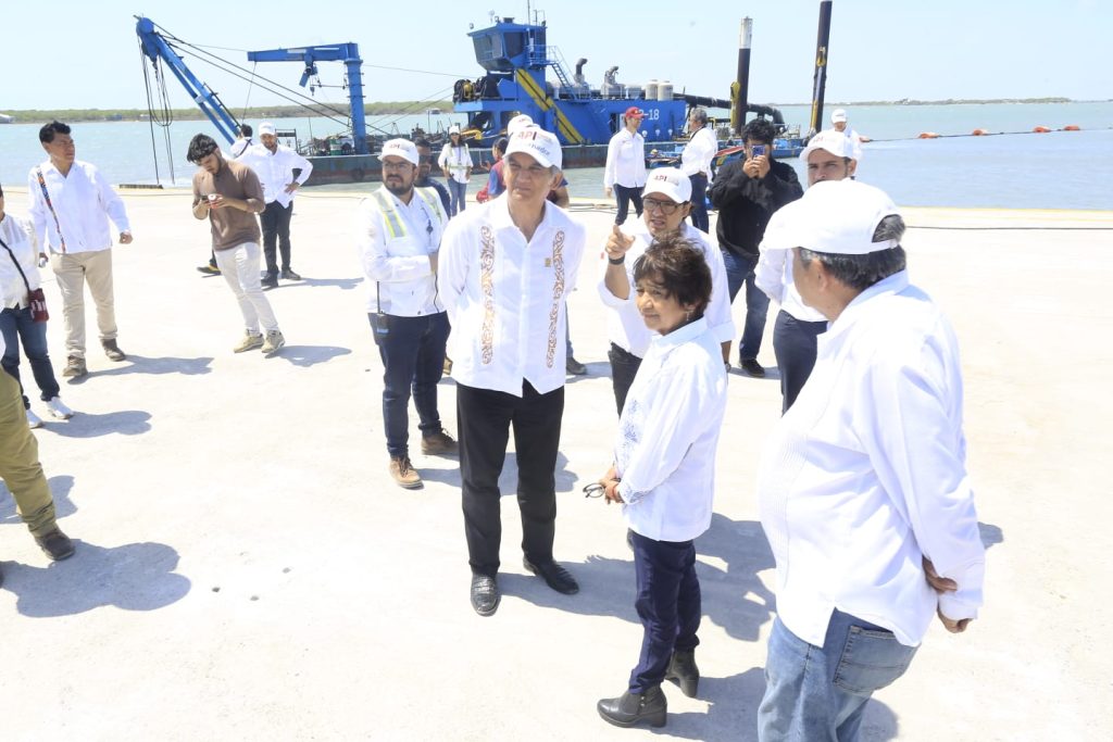 En la zona del muelle, supervisaron los trabajos que realiza la draga Montebello ADR-18, la cual cuenta con un tubo de 2 kilómetros de extensión, de 24 pulgadas de diámetro, con una capacidad de bombeo de 7 mil metros cúbicos por turno.