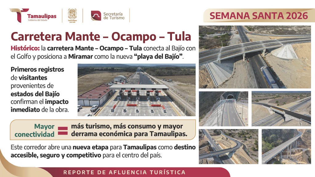 El secretario de Turismo, Benjamín Hernández, detalló que durante la Semana Santa 2026 se registraron 2,141,272 visitantes a sitios turísticos; 265 mil 720 personas más que en el mismo periodo del año anterior, lo que representa un incremento del 14.16%, con una derrama económica en 10 días de 2,153,794 pesos, destacando la playa Miramar, de Madero, con 933,876 visitantes, y playa Bagdad con 348,187 visitantes, un incremento en este sitio de 476% respecto a 2025, en el municipio de Matamoros.