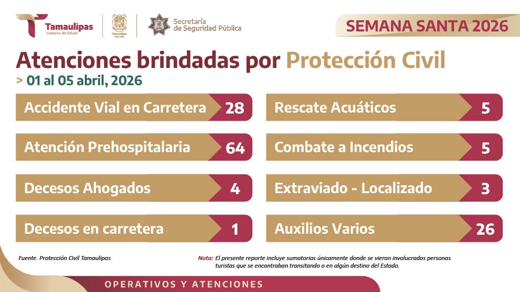 Por su parte, Willy Zúñiga Castillo, titular del Secretariado Ejecutivo del Sistema Estatal de Seguridad Pública, expresó que elementos de Protección Civil atendieron 28 accidentes viales en carretera y 64 servicios de atención prehospitalaria, además de cinco rescates acuáticos, en tanto que el Centro Regulador de Urgencias Médicas proporcionó 141 atenciones prehospitalarias y atendió 35 accidentes carreteros, con un total de 63 personas lesionadas, 30 de los cuales requirieron traslado a unidades hospitalarias para su valoración médica.