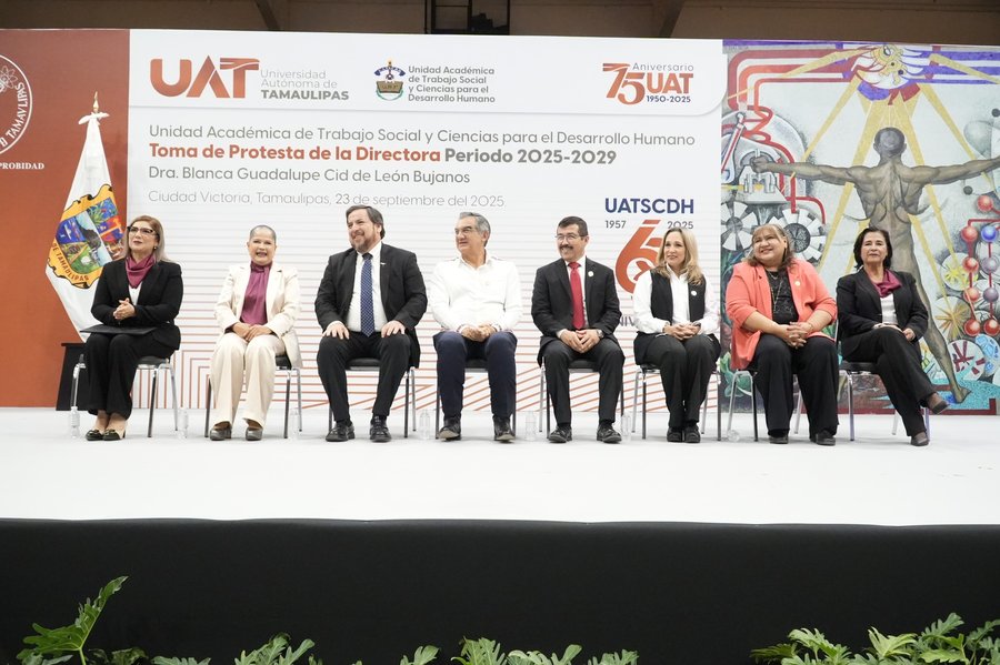 “ Teniendo como testigo de honor al gobernador Américo Villarreal Anaya, el rector de la Universidad Autónoma de Tamaulipas (UAT), Dámaso Anaya Alvarado, le tomó protesta a la nueva directora de la Unidad Académica de Trabajo Social y Ciencias para el Desarrollo Humano (UATSCDH), Dra. Blanca Guadalupe Cid de León Bujanos, quien asume el cargo para el periodo 2025-2029. “
