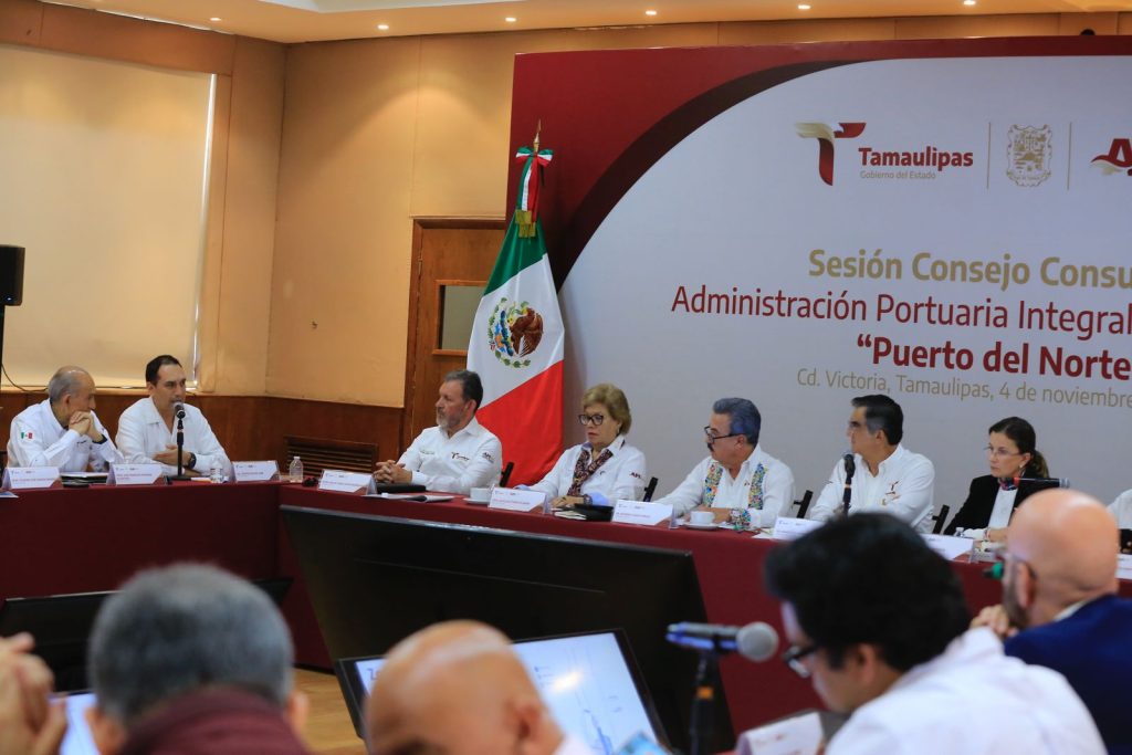Ciudad Victoria, Tamaulipas.- Al presidir la sesión del Consejo Consultivo de la Administración Portuaria Integral de Tamaulipas, Puerto del Norte, el gobernador Américo Villarreal Anaya reiteró su compromiso para apoyar las gestiones y las autorizaciones necesarias a fin de seguir impulsando este gran proyecto, que tiene una alta rentabilidad para el desarrollo nacional y que permitirá convertir a Tamaulipas en la principal frontera marítima del país.