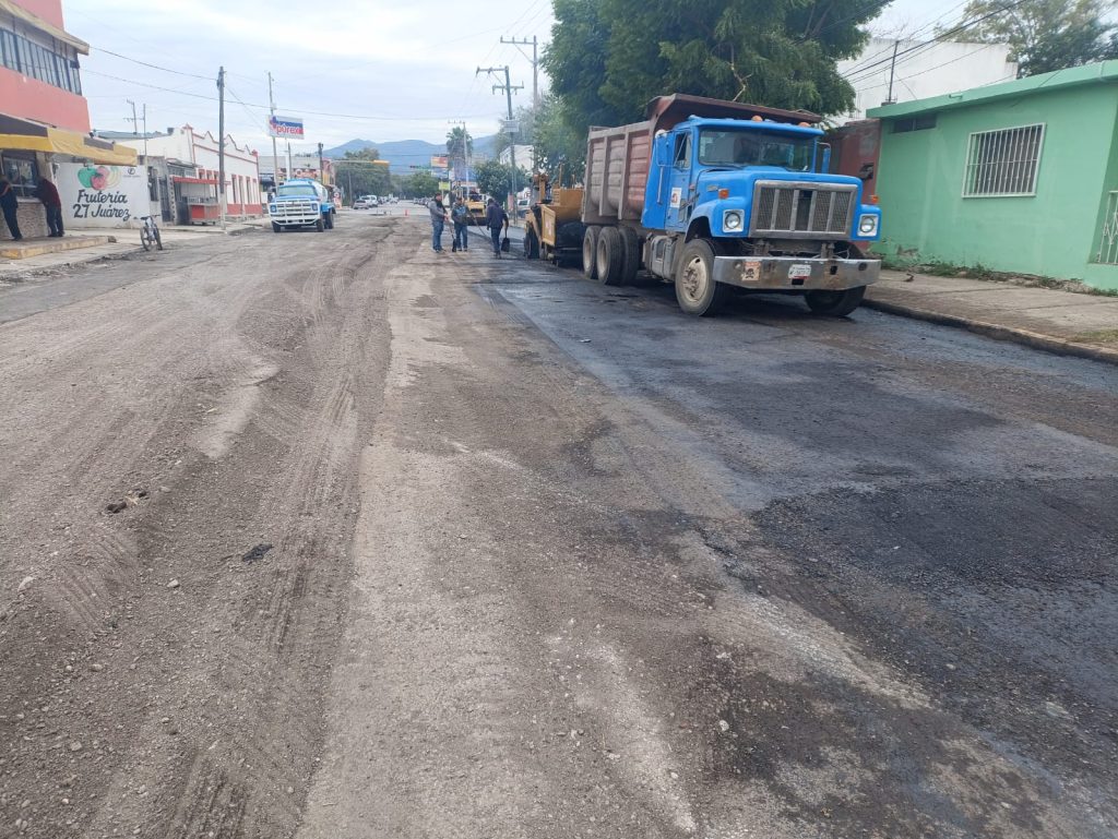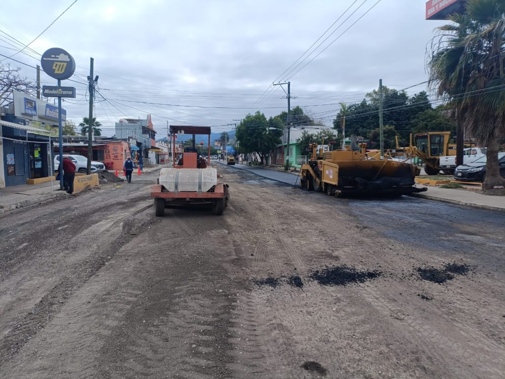 Tras la restitución de 900 metros de red central y tomas domiciliarias de agua potable por parte de COMAPA y nivelación de superficie, cuadrillas de la secretaría de Obras Públicas del Municipio iniciaron la aplicación de nueva carpeta asfáltica en los 12,743 metros cuadrados proyectados a restituir.